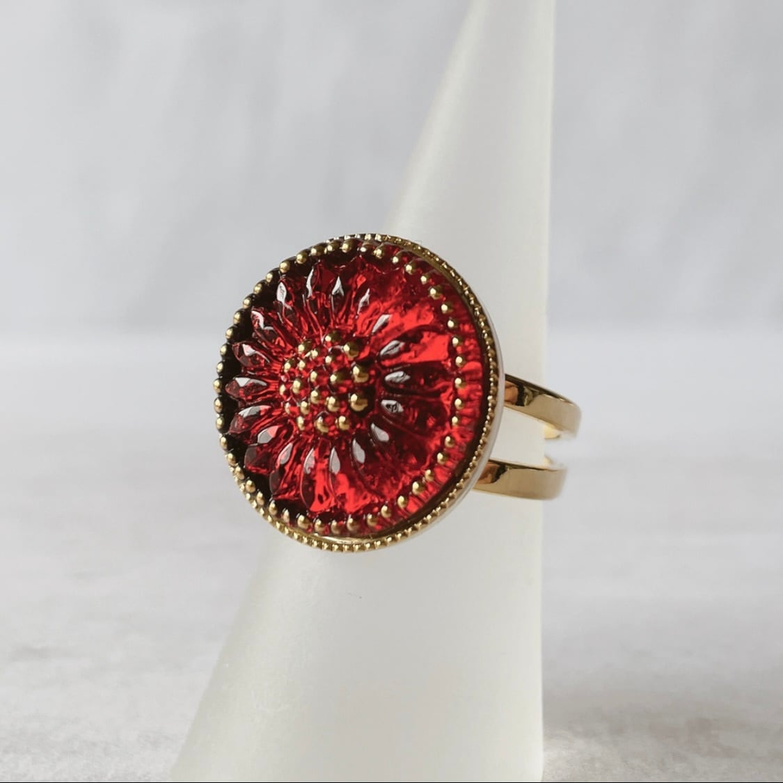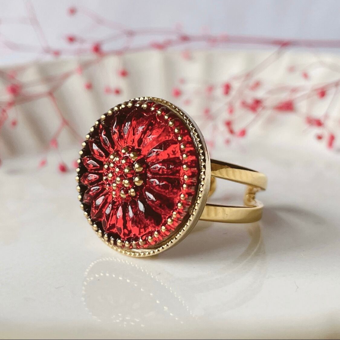 心に灯る赤*チェコガラスレッドの花模様のフリーサイズリング / レトロな差し色アクセサリー フォークリング