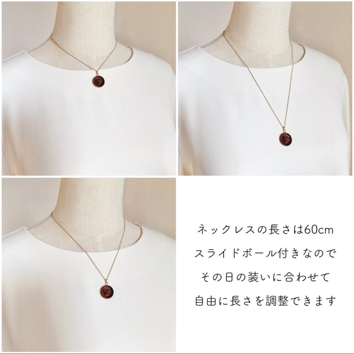 チェーンにはスライドボール金具を採用。チョーカー風に短くしても、ロングネックレスとして揺らしても、コーディネートや気分に合わせて自由に長さを調整できます。「首元の開きに合わせて使い分けられるネックレスが欲しい」というお客様の声にも応えられる一本です。