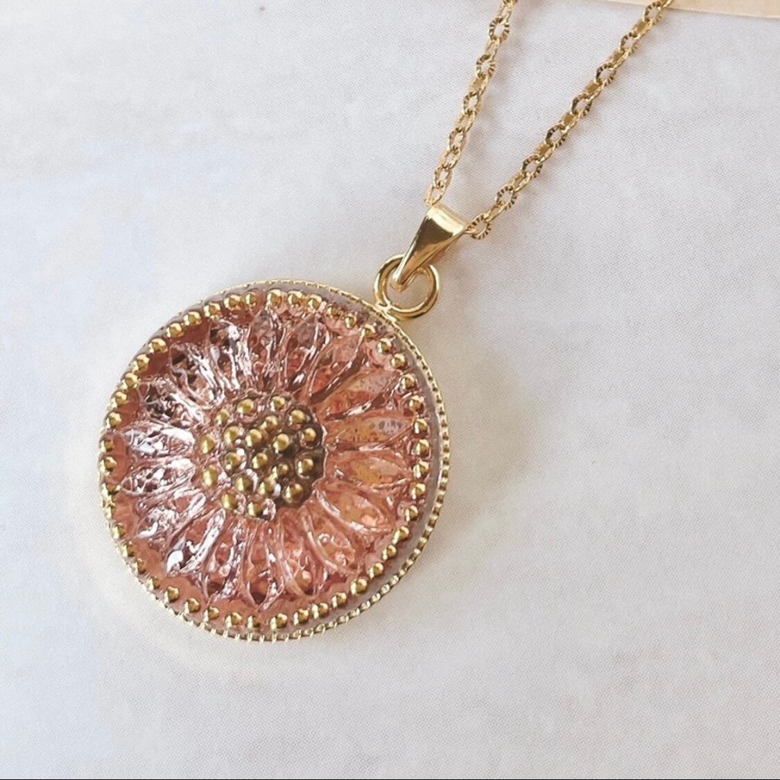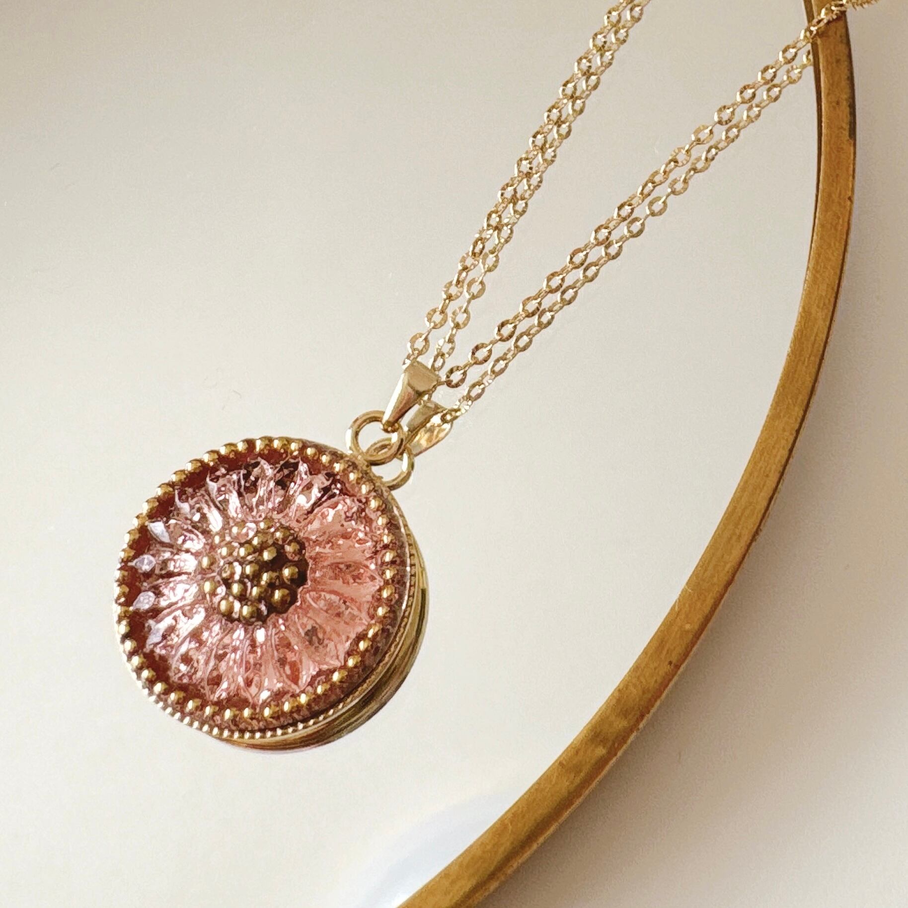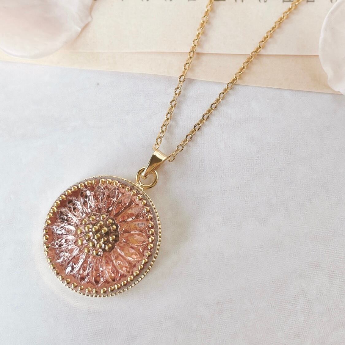 ピンクフラワーのチェコガラスボタンネックレス|淡い光をまとう上品な一粒デザイン(スライドボール・サージカルステンレス)
