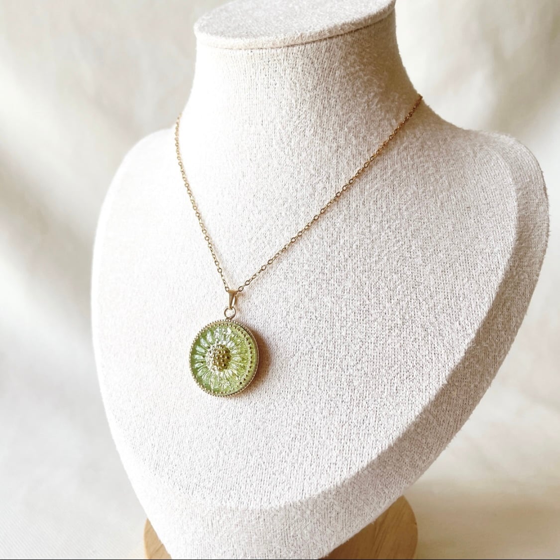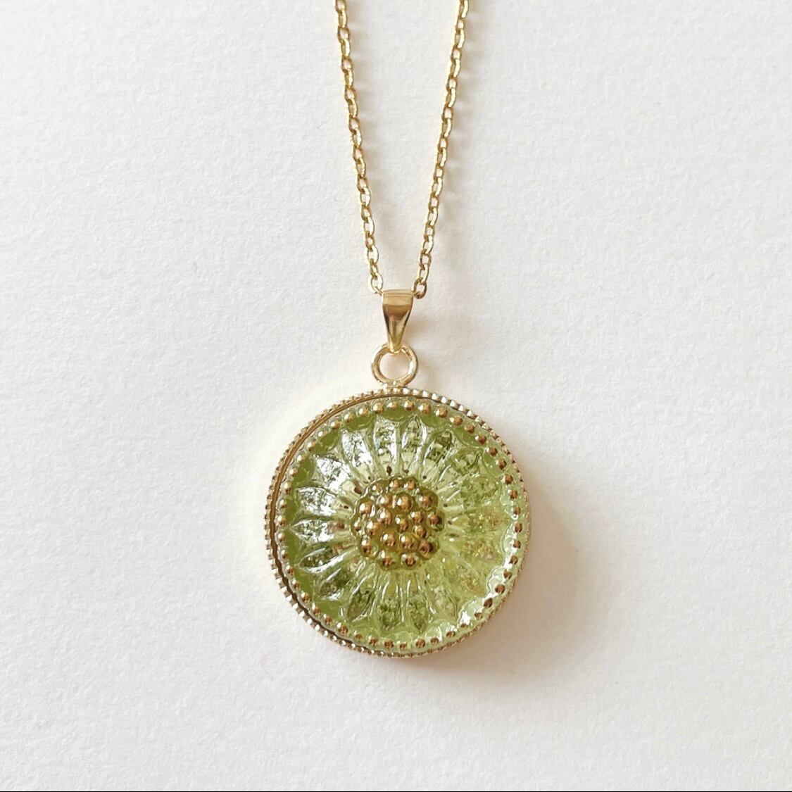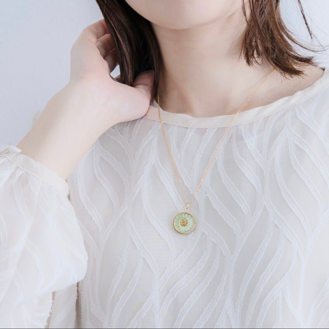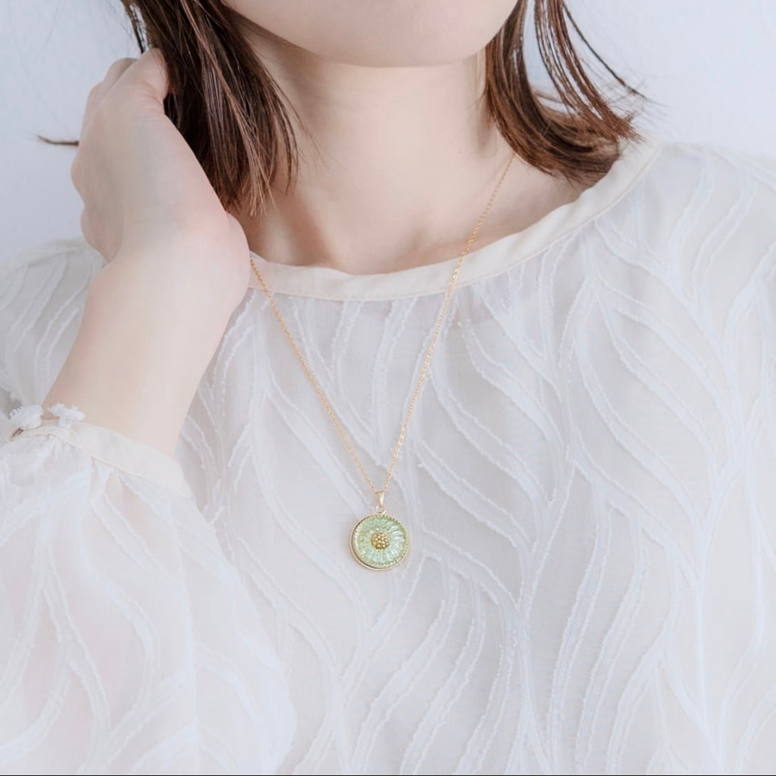 淡いイエローのフラワーモチーフが、光を受けて胸元でそっと咲くネックレスです。