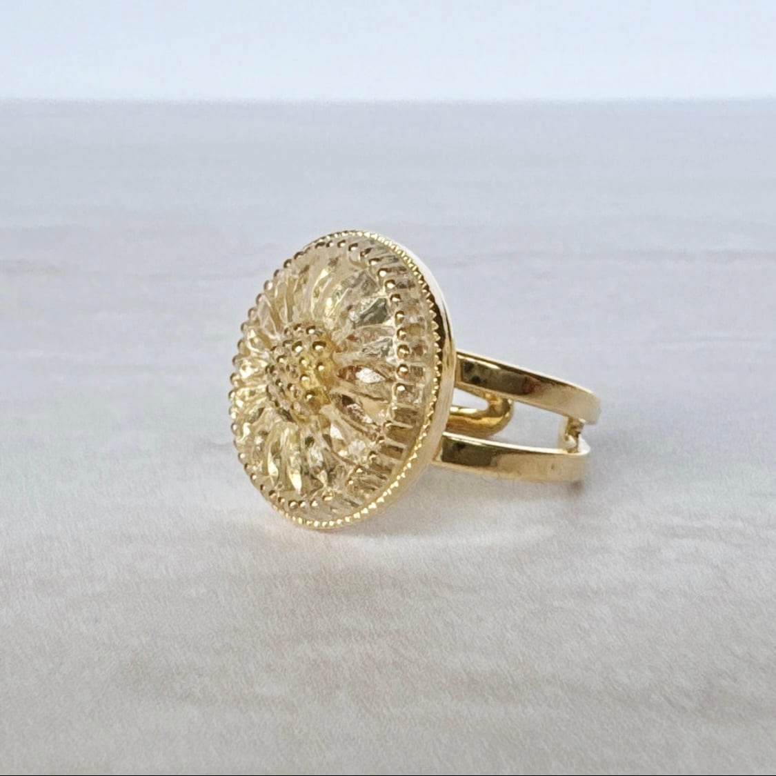 太陽の光をやさしくまとったような、クリアなチェコガラスボタンのリング。