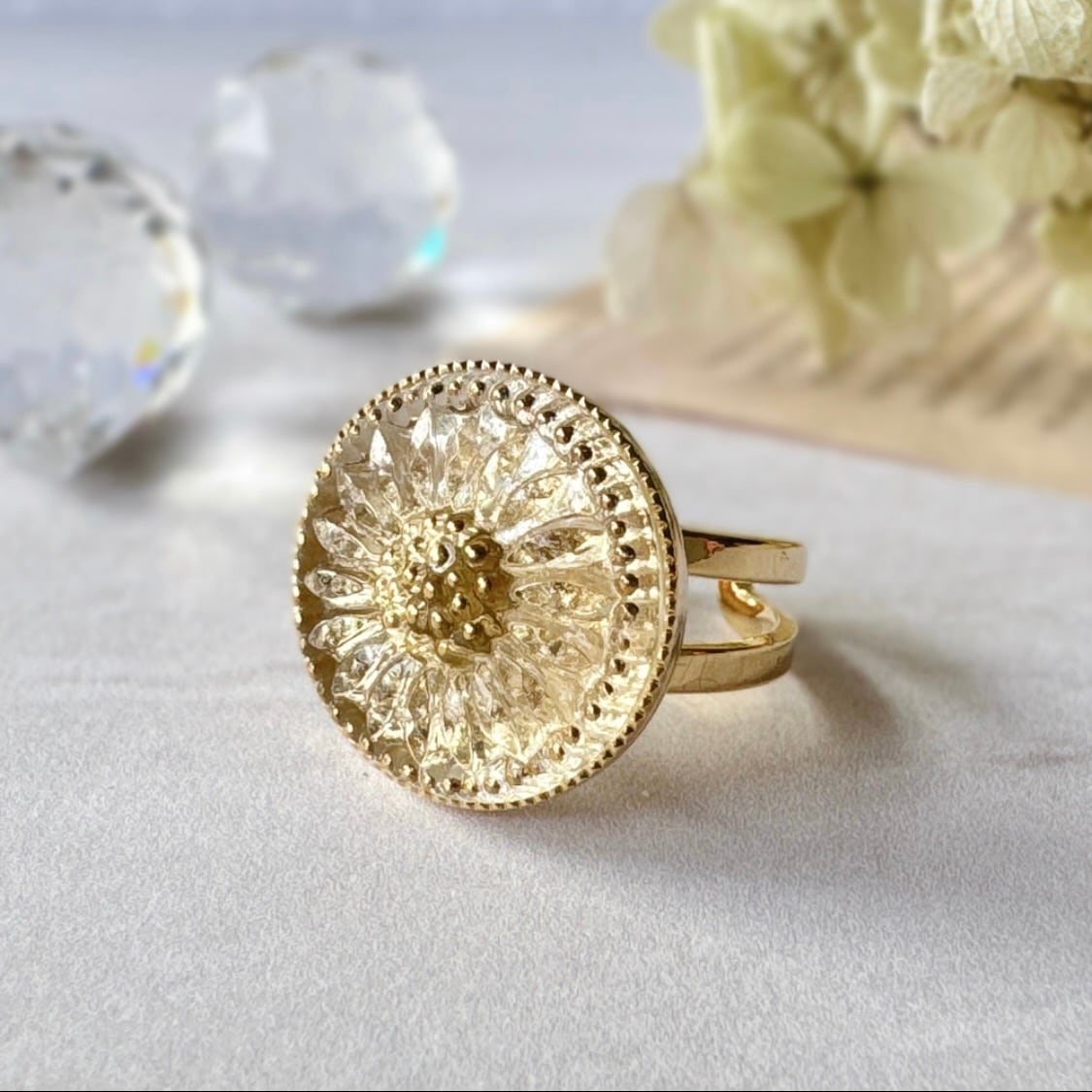 チェコガラスボタン クリアフラワーリング|透明×ゴールド フリーサイズ|フォークリング・オープンリング