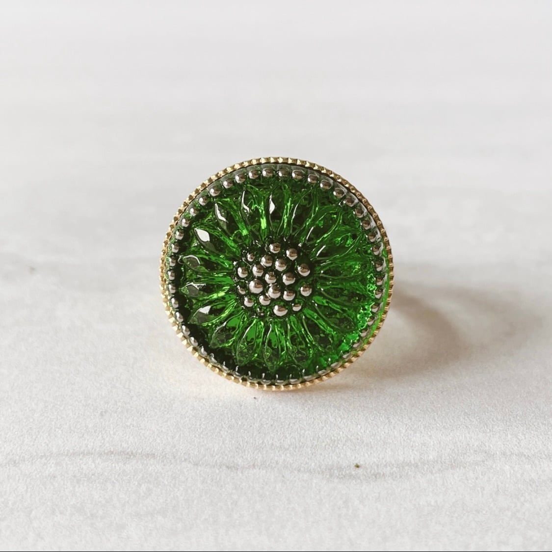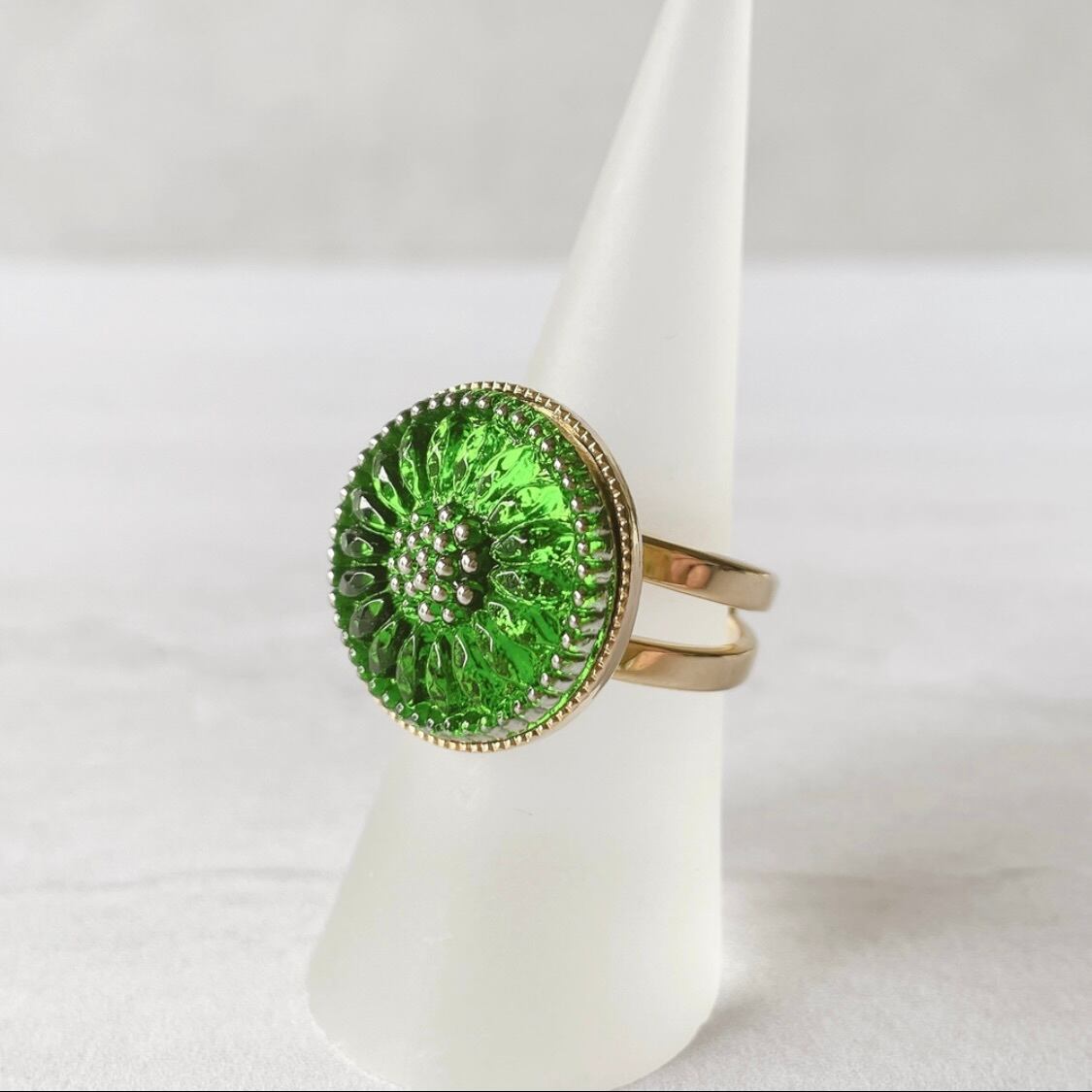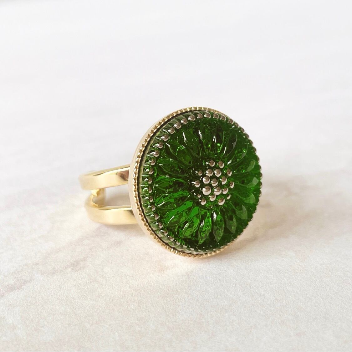 チェコガラスボタン/グリーンフラワーのリング*クラシカル&アンティーク調/フリーサイズ