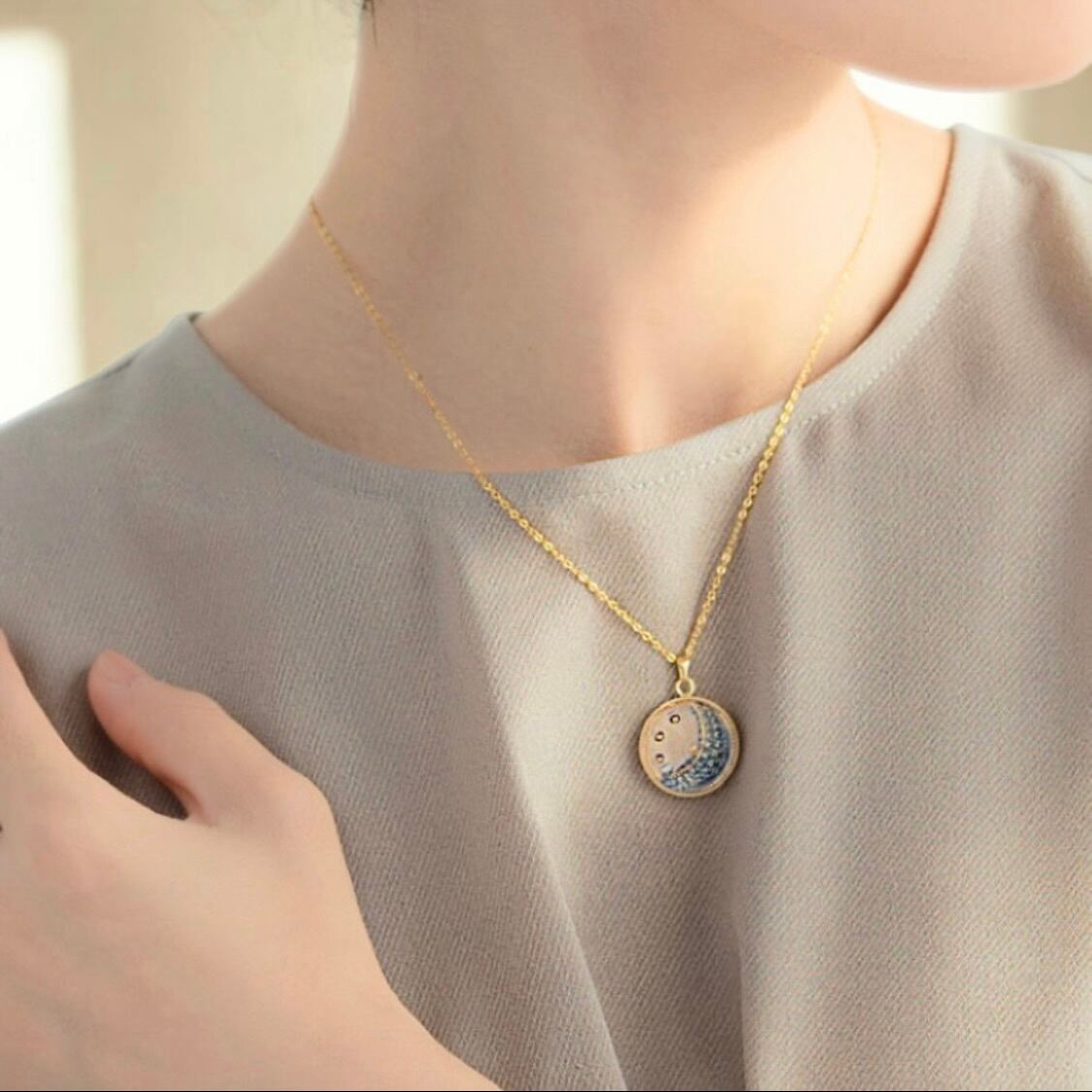 「once in a blue moon(めったにないこと)」という言葉のように、特別な瞬間を胸元に閉じ込めたい──そんな思いから生まれたデザインです。