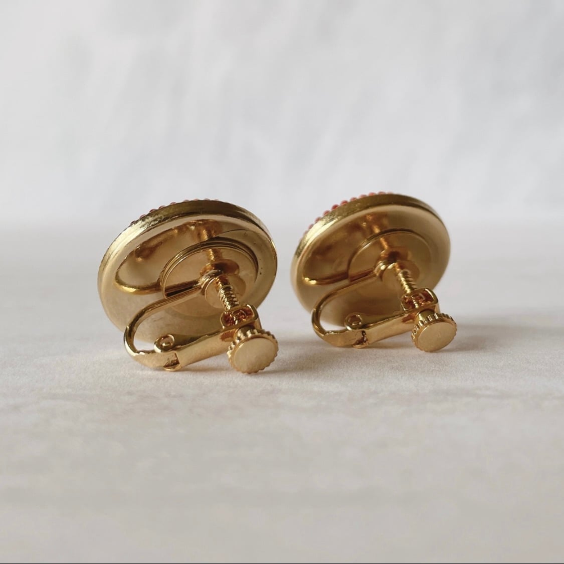 秋の夕暮れを思わせる深みのあるオレンジカラーのチェコガラスボタンを使った、フラワーモチーフのピアス・イヤリングです。