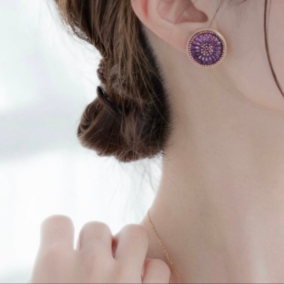 深紫のチェコガラスボタンピアス/イヤリング|光を宿す花モチーフ・上品な大人のアクセサリー
