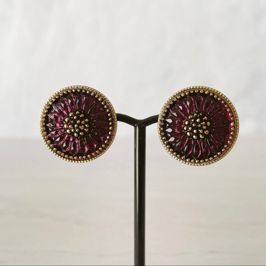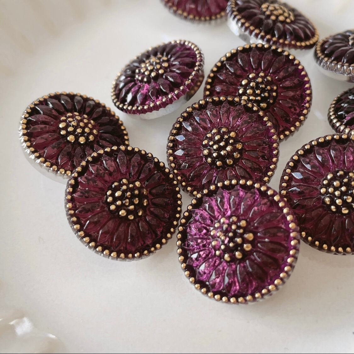 深みのあるパープルが印象的な、花モチーフのチェコガラスボタンピアス/イヤリング。