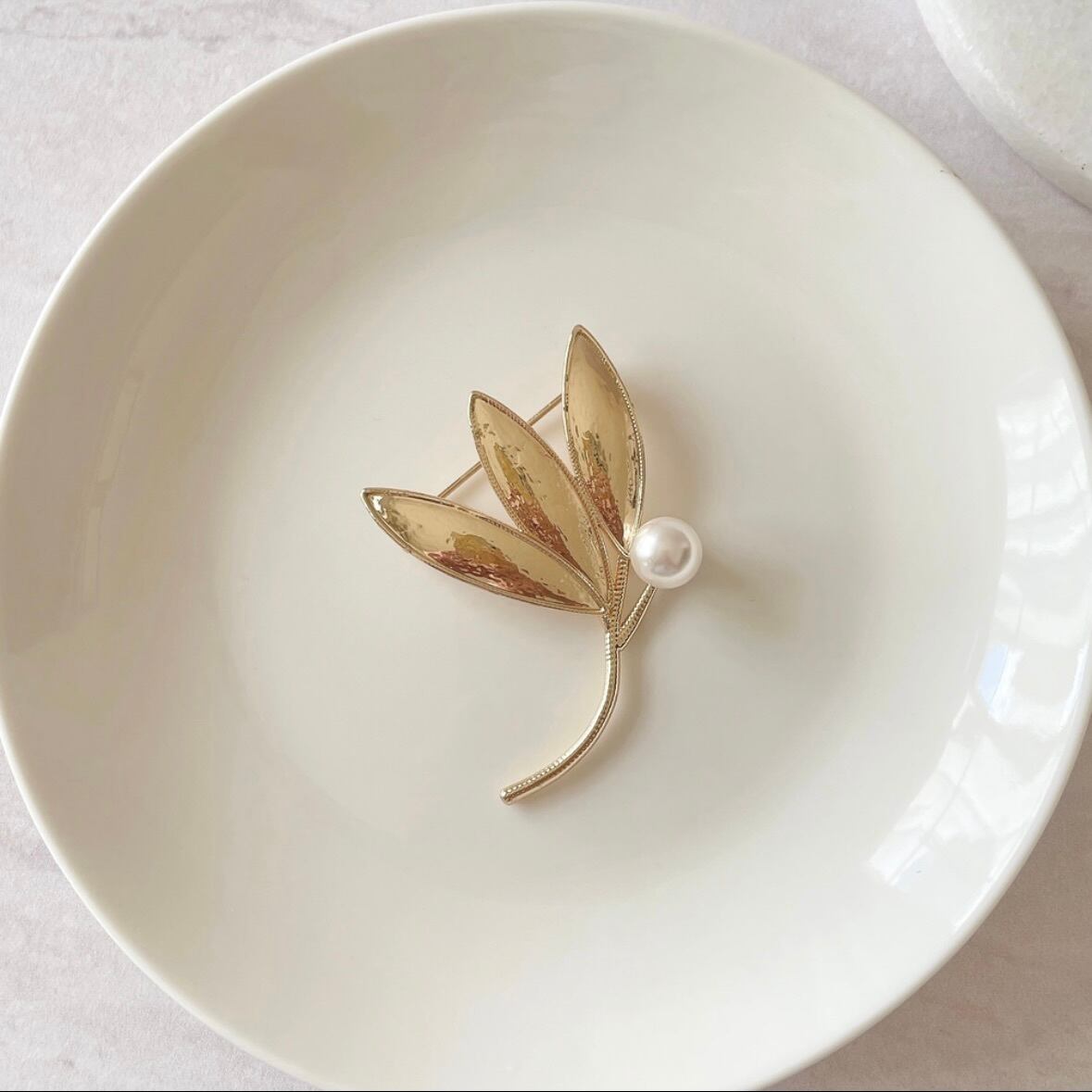 リーフモチーフのブローチは、落ち着いたゴールドカラーに一粒パールを添えたデザイン。