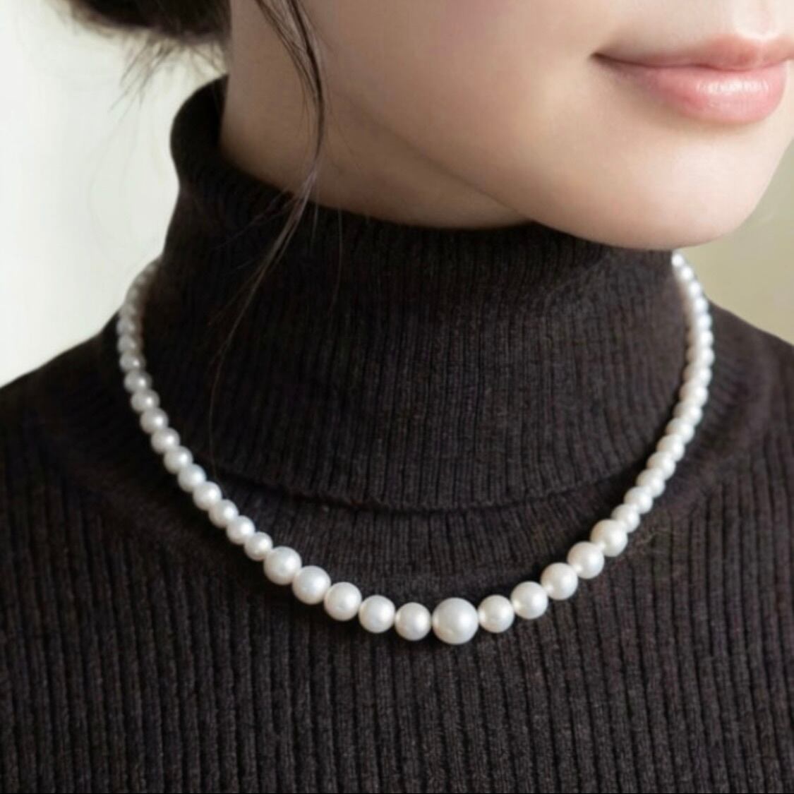 クリスタルパールのやさしい艶が首元を上品に彩る、グラデーションデザインのパールネックレスです。