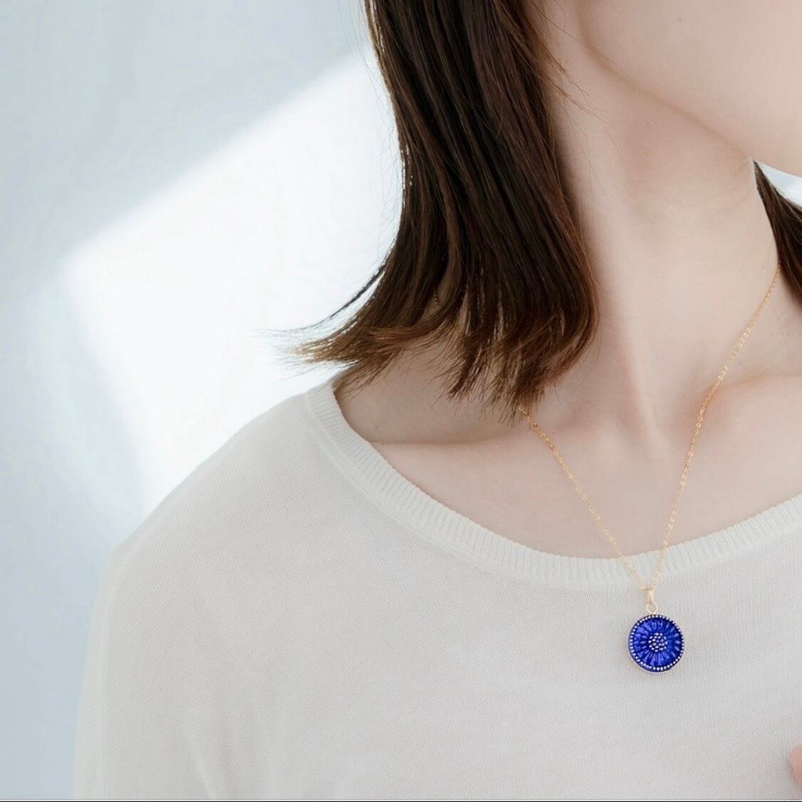胸元に程よく収まり、タートルネックやワンピース、シンプルなトップスなど、季節を問わず合わせやすい長さです。