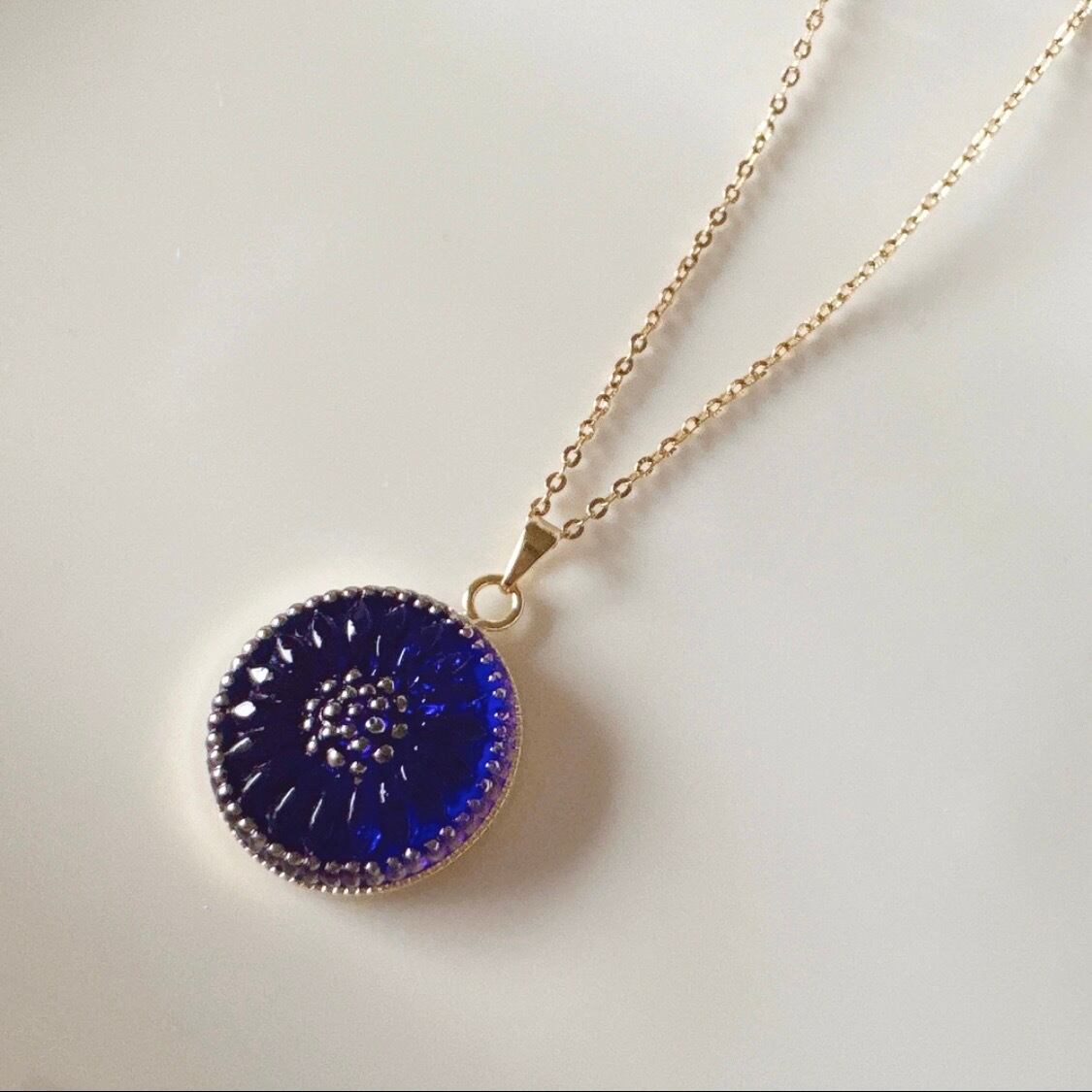 落ち着いたディープブルーが印象に残る、チェコガラスボタンのネックレスです。
