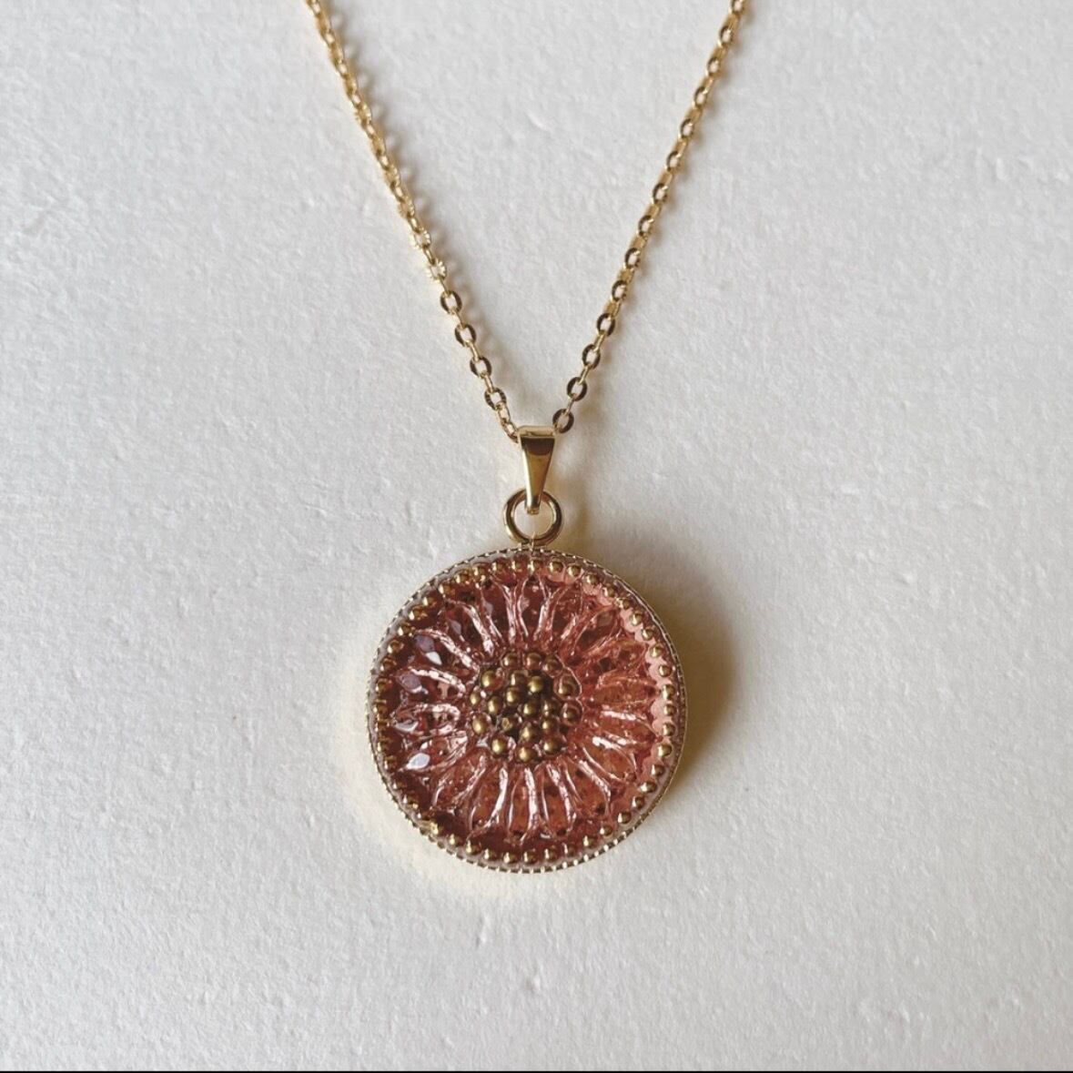 チェコガラスボタン、真鍮製台座、サージカルステンレスチェーン