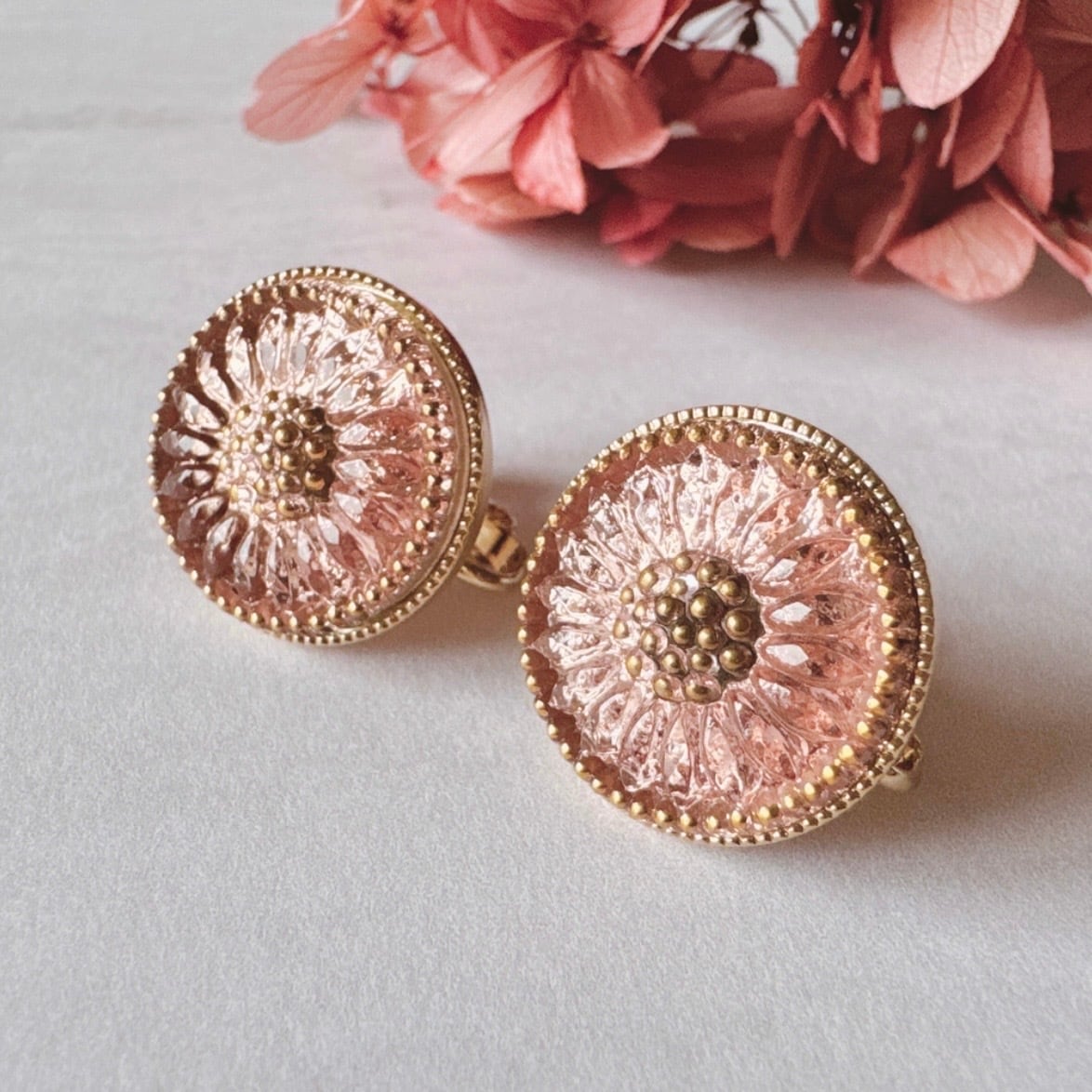チェコガラスボタン ヴィンテージピンクのピアス/イヤリング レトロな花モチーフ